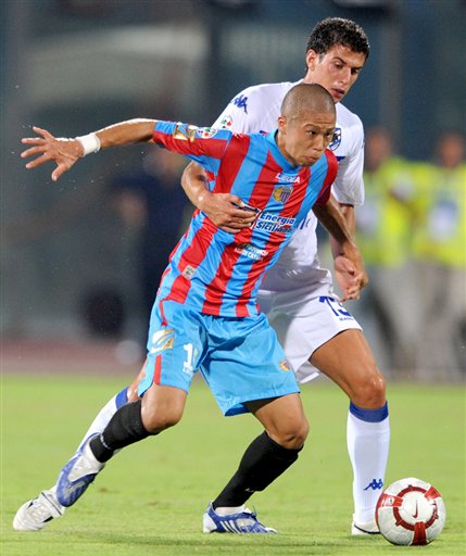 Takayuki Morimoto, Marco Rossi 2015年5月28日 429 × 512 08/09 Calcio Catania S.p.A (H) 15 MORIMOTO Catania’s Takayuki Morimoto, of Japan, left, and Sampdoria’s Marco Rossi challenge for the ball during the Italian Serie A soccer match between Catania and Sampdoria in Catania, Italy, Sunday, Aug. 23, 2009. (AP Photo/Francesco Pecoraro)