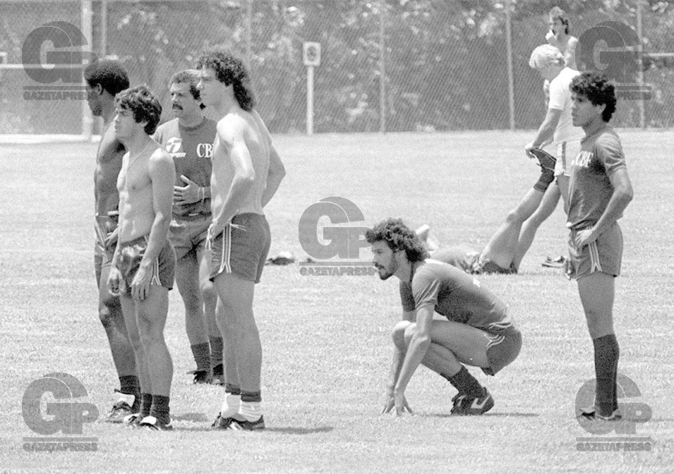 FUTEBOL – CASAGRANDE – ESPORTES – ACERVO – Os jogadores da Seleção Brasileira(da esquerda para direita): Edivaldo, Julio César(atrás), Casagrande, Júnior(atrás), Sócrates e Silas, durante o treino preparatório para a partida contra a Espanha, válida pela Copa do Mundo de 1986, no México – Centro de Treinamento – Guadalajara – México – 30-05-1986 – Foto: Acervo/Gazeta Press