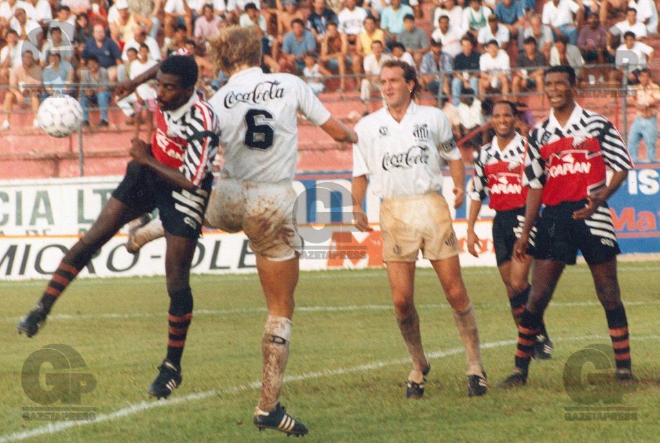 FUTEBOL – CUCA – ESPORTES – ACERVO – Cuca(o terceiro da esquerda para direita) e Darci(o segundo da esquerda para direita), jogadores do Santos, durante partida contra o Ituano, válida pelo Campeonato Paulista de 1993 – Estádio Novelli Júnior – Itu – SP – Brasil – 20-02-1993 – Foto: Acervo/Gazeta Press
