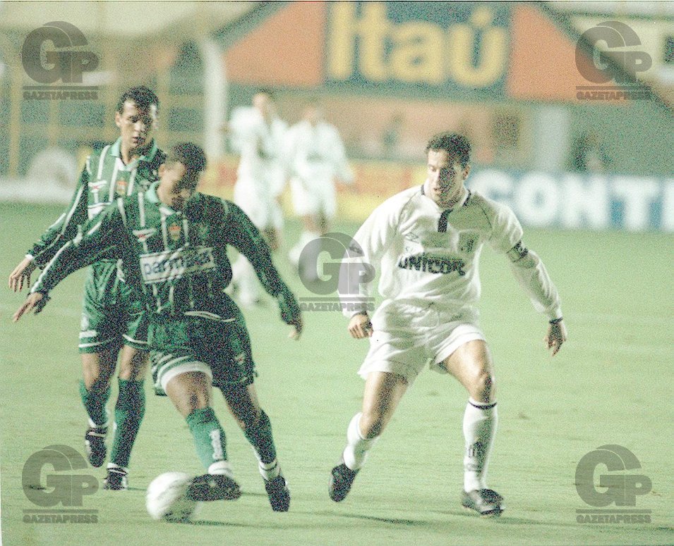 FUTEBOL – HISTÓRIA DO SANTOS – ESPORTES – ACERVO – Os jogadores Marquinhos(E), do Palmeiras; e Careca, do Santos, durante partida válida pelo Campeonato Paulista de 1997 – Estádio Urbano Caldeira(Vila Belmiro) – Santos – SP – Brasil – 04/06/1997 – Foto: Acervo/Gazeta Press