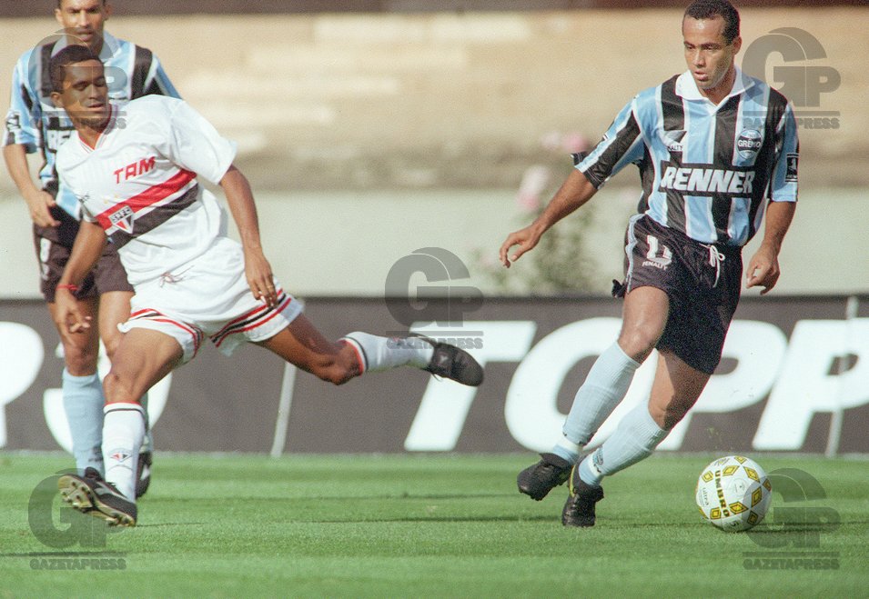 FUTEBOL – SERGINHO – ESPORTES – ACERVO – Os jogadores Serginho(E), do São Paulo FC; e Aílton, do Grêmio, durante partida válida pelo Campeonato Brasileiro de 1996 – Estádio Cícero Pompeu de Toledo(Morumbi) – São Paulo – SP – Brasil – 09/11/1996 – Foto: Acervo/Gazeta Press
