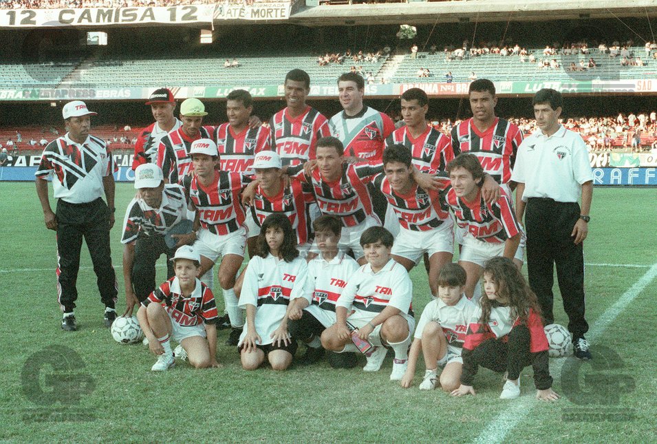FUTEBOL – LEONARDO – ESPORTES – ACERVO – Os jogadores do São Paulo Fc em pé(da esquerda para a direita): Axel, Muller, Júnior Baiano, o goleiro Zetti, Cafu e Gilmar – Agachados: Palhinha, Euller, Válber, André Luiz e Leonardo, antes da partida contra o Corinthians, válida pelo Campeonato Paulista de 1994 – Estádio Cícero Pompeu de Toledo(Morumbi) – São Paulo – SP – Brasil – 08/05/1994 – Foto: Acervo/Gazeta Press