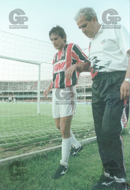 FUTEBOL – LEONARDO – ESPORTES – ACERVO – Leonardo(E), jogador do São Paulo FC, deixa o campo ao lado do médico José Sanchez durante partida contra o Corinthians, válida pelo Campeonato Paulista de 1994 – Estádio Cícero Pompeu de Toledo(Morumbi) – São Paulo – SP – Brasil – 08/05/1994 – Foto: Acervo/Gazeta Press