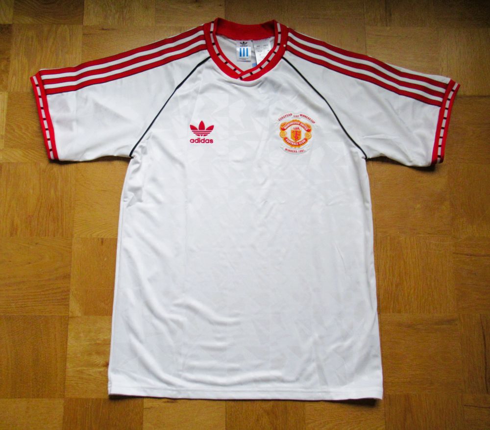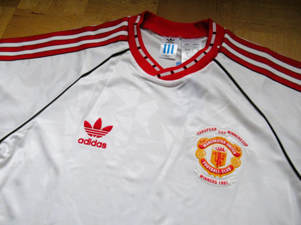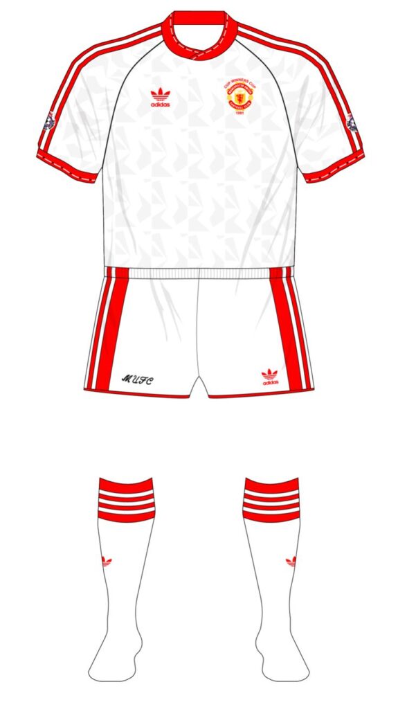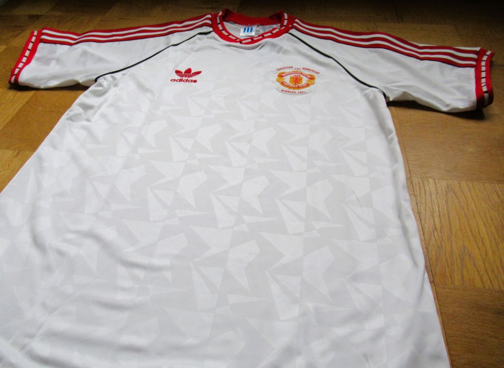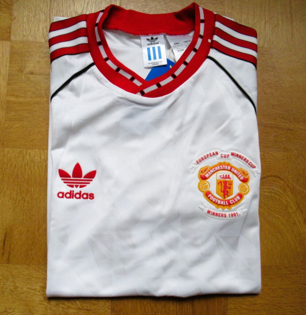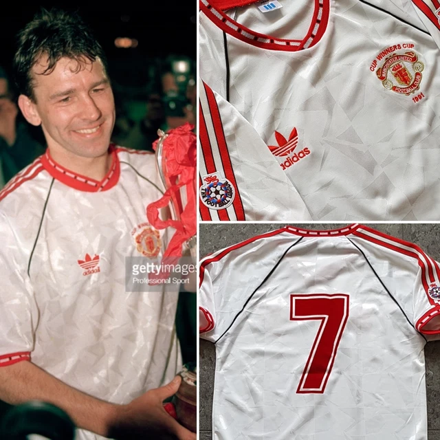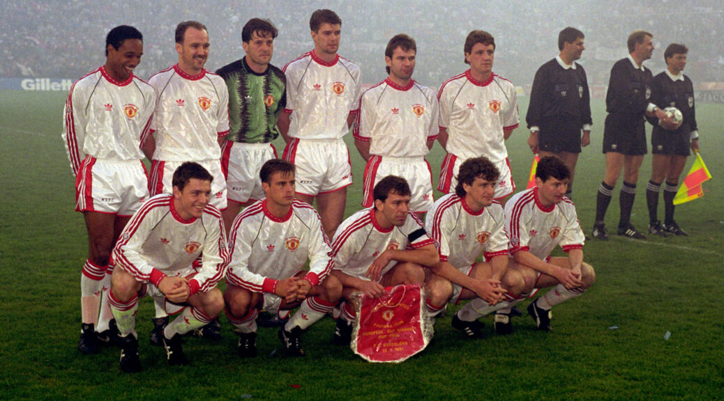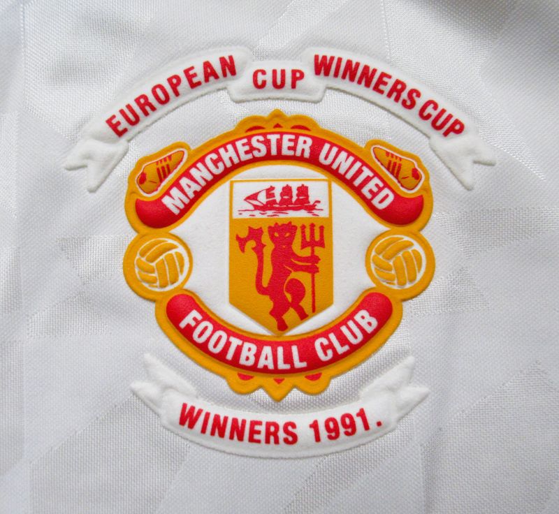 WEFA Cup Winners Cup Final Model 対バルセロナで2-1でManUが勝利しました。 最近こういう復刻ユニフォームが販売されることが増えて嬉しい限りです。 当時は欲しくても売っているところさえわからず、持っている人は羨望のまなざしで見られていました。 当時はこの発泡素材のエンブレムがとっても珍しくて、初めて見たときは衝撃的でした!Football, UEFA Cup Winners Cup Final, Rotterdam, Holland, 15th May 1991, Manchester United 2 v Barcelona 1, Manchester United’s Mark Hughes moves past Barcelona captain Jose Alexanco (Photo by Bob Thomas/Getty Images)